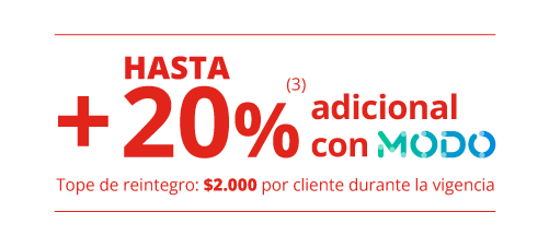 (3) Aquellos clientes que abonen su compra con Tarjeta de Crédito Visa y Mastercard emitidas por el banco y que para realizar dicho pago utilicen Modo desde la app Banco Entre Ríos o app Modo, recibirán un reintegro adicional del 20% calculado sobre el importe de la compra. Tope de reintegro $ 2.000 por cliente durante la vigencia. Previo a realizar el pago el cliente deberá haber asociado a Modo la cuenta y tarjeta de crédito del Banco Entre Ríos con la que realizará la compra. Reintegro: se realizará dentro de los 30 días de realizada la compra en la cuenta que el cliente tiene abierta en el banco y asoció a Modo. Válido para comercios que operen con Modo.