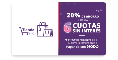 Válido para cartera de consumo. Vigencia desde el 12/06/2023 al 17/06/2023 inclusive, promoción disponible todos los días durante su vigencia. 1. Stock: Consulte previamente el stock disponible en cada uno de los productos. 2. Descuentos Aplicables: Consulte descuento aplicable en cada uno de los productos incluidos en la promoción. 3. Precio promocional y entrega del bien: los descuentos promocionados se efectivizaron al momento de realizar la compra con Tarjeta de Crédito, por lo que no se realizará por reintegro en su resumen de tarjeta de crédito. La entrega a domicilio tiene un cargo adicional y deberá acordarse con el vendedor, al terminar la compra recibirá los datos del vendedor para acordar la entrega. 4. Envío gratis: Solo en productos seleccionados. (4) Beneficio pagá con MODO: Válido en compras que se realicen con tarjeta de crédito Visa o MasterCard, emitidas por el Nuevo Banco de Entre Ríos S.A, Nuevo Banco de Santa Fe S.A, Banco de Santa Cruz S.A, Banco San Juan S.A. en hasta 6 cuotas sin interés sobre precio de contado en toda la tienda, promoción válida sólo si el cliente abona su compra en la tienda utilizando MODO desde la app de su Banco o app MODO. Promoción: 20% de reintegro sobre el monto de la compra con un tope de reintegro de $2.000 por cliente durante la vigencia de la promoción. Reintegro: se realizará dentro de los 30 días de realizada la compra en la cuenta que el cliente tenga abierta en el Banco y asociada a MODO. Promoción acumulable con otras promociones bancarias. Previo a hacer el pago el cliente deberá haber asociado a MODO la Tarjeta de crédito de los bancos mencionados con la que realizará la compra. El beneficio aplica única y exclusivamente PAGANDO con MODO en la forma indicada; quedan excluidos por tanto los pagos a través de otras billeteras virtuales y/o plataformas de pago online (por ejemplo, Paypal, Mercadopago, Aula, etc.). Para conocer cómo utilizar MODO desde la App de los Bancos, ingrese a los sitios web de los Bancos. La vinculación de tarjetas quedan sujetas a las condiciones establecidas por cada Banco, el que podrá denegar una vinculación. Los costos de navegación y/o descarga son establecidos por la compañía de telefonía celular contratada por el usuario. La promoción no aplica a compras del rubro categoría turismo. La financiación no es aplicable para las compras realizadas con cualquier tipo de financiación bajo el Programa de Fomento al Consumo y a la Producción de Bienes y Servicios, denominado ""AHORA 12"" COSTO FINANCIERO TOTAL EFECTIVO ANUAL (C.F.T.N.A.): 0,00%. TNA (TASA NOMINAL ANUAL): 0,00%, TEA (TASA EFECTIVA ANUAL): 0,00%. SUJETO A LÍMITE DE COMPRA Y FINANCIACIÓN DISPONIBLE DE LA TARJETA AL MOMENTO DE EFECTUAR LA COMPRA. Ejemplo: Ud. podrá financiar una compra a precio de contado de $15.000 en 3 cuotas fijas de $5.000 c/u o en 6 cuotas fijas de $2.500 c/u con Tarjeta de Crédito Visa o Mastercard emitida por el Banco utilizando MODO desde la app del Banco. Recibirá en en el resumen en el cual ingrese el consumo (la primer cuota) o en el posterior un reintegro "Paga con Modo" de $2000 (tope por cliente durante la vigencia). (5) Promoción primera compra con MODO OnLine: Válida cartera de consumo. 1.Condiciones generales: Promoción organizada por Play Digital S.A., CUIT 30-71682943-6, con domicilio en Av. del Libertador 7208, Torre II, Piso 4, CABA ("PDSA"). Serán igualmente de aplicación a esta promoción los Términos y Condiciones de la App MODO disponibles en https://www.modo.com.ar/terminos-y-condiciones-app-modo. 2.Vigencia: Desde las 00:00 horas del día 14 de noviembre de 2022 hasta las 23:59 horas del día 30 de Junio de 2023, inclusive. 3.Elegibilidad: Aplicable a todas las personas humanas que cumplan con la totalidad de los siguientes requisitos: (i)Realicen su primer pago online en cualquier tienda online adherida (ver listado en (el "Comercio Adherido") a través del botón de MODO (en adelante, "MODO"); (ii) Que el monto de la compra sea superior a $600 (seiscientos pesos); (iii)Que dicho pago a comercios sea realizado con tarjetas de crédito, débito o prepagas emitidas en la República Argentina por alguna de las entidades adheridas a esta promoción (ver listado de entidades en https://smex-ctp.trendmicro.com:443/wis/clicktime/v1/query?url=https%3a%2f%2fwww.modo.com.ar%2fpromos%2fprimeracompraonline&umid=5c038fa2-cd41-4b1b-ae26-20d5ed5106aa&auth=b401237f11941e558d8012f6cb008e1dc0599fe2-caba7b5a8ed3a6597e241a1088fb9179ec395a7b) (en adelante, "Entidades Adheridas"); (iv) Que tengan una cuenta abierta en la Entidad Adherida emisora de la tarjeta con la que realicen el pago, y que dicha cuenta se encuentre asociada a MODO dentro de los quince días de finalizada la Promoción; y (v)No registren deuda o mora en ningún producto de la Entidad Adherida con la que realice el pago (conjuntamente, el "Participante").4.Bonificación: A los Participantes se les otorgará en su primera compra on line la suma de $1000 (pesos mil) (la "Bonificación"). En ningún caso las Bonificaciones podrán superar la suma de $1000 (pesos mil) por Entidad Adherida. La Bonificación podrá ser acumulable con otros descuentos bancarios vigentes. 5.Plazo y forma de acreditación: Dentro de los 30 días luego de ocurrida la transacción. El monto de cada Bonificación será depositado en la cuenta del Participante referida en el punto 3 (iii).6.Impuestos. Responsabilidad: Todo impuesto y/o gasto aplicable a la Bonificación será a exclusivo cargo de los Participantes. PDSA se reserva el derecho a limitar o prohibir la participación de cualquier persona o usuario en la Bonificación en caso de presumir la existencia de fraude o alteración en la mecánica de participación sin asumir responsabilidad alguna frente a tales personas, usuarios o terceros. PDSA no se responsabilizará ni otorgará indemnización alguna, contractual y/o extracontractual, bajo ningún concepto, como así tampo