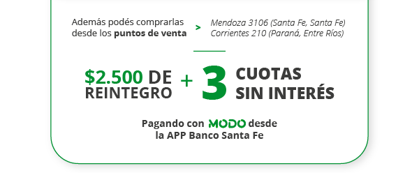 Válido cartera de consumo: Vigencia desde el 15/06/2023 al 15/07/2023 inclusive, promoción disponible todos los días durante su vigencia. Promoción (1) y (2): Válido para compras de entradas abonando con tarjetas de crédito Visa o MasterCard, emitidas por el Nuevo Banco de Santa Fe SA utilizando MODO desde la app Banco Santa Fe o app MODO (1) Primera Compra con MODO ON LINE: realizadas únicamente en el sitio electrónico dispuesto por el organizador www.tiendafdd.com.ar. y abonadas en un pago recibirá un reintegro de $ 3.500 (tres mil quinientos) por única vez en la primera compra, durante la vigencia de la promoción. Tope de reintegro de $3500 (pesos tres mil quinientos) por cliente durante la vigencia. (2) Compra presencial con MODO: realizadas únicamente en los puntos físicos dispuestos por el Organizador, y abonando en hasta 3 cuotas sin interés recibirá, un reintegro de $2500 (pesos dos mil quinientos) por única vez en la primera compra durante la vigencia de la promoción. Tope de reintegro de $2500 (pesos dos mil quinientos) por cliente durante la vigencia. Costo Financiero Total (C.F.T.): 0,00%, Tasa Efectiva Anual (T.E.A.): 0,00%, Tasa Nominal Anual (T.N.A.): 0,00% Costo de financiación a cargo del Nuevo Banco de Santa Fe SA. Ejemplos: (1): Si el cliente abonó su compra de entradas online en el sitio del organizador de $ 14.000 en un pago con tarjetas de Crédito Visa o Mastercard emitidas por el BANCO utilizando MODO desde la app Banco Santa Fe o app MODO recibirá en el resumen de su tarjeta de crédito un consumo de $ 14.000 y un reintegro de $ 3.500. (2) Si el cliente abonó una compra de entradas de $ 15.000 (pesos quince mil) en 3 cuotas fijas de $5000 (pesos cinco mil) sin interés c/u con tarjeta de Crédito Visa o Mastercard emitida por el BANCO utilizando MODO desde la app Banco Santa Fe s o app MODO además de la financiación, en la primera liquidación de su tarjeta recibirá un consumo de $ 5.000 y un reintegro de $ 2.500. En la segunda y tercera liquidación posterior a la compra, recibirá un consumo de $ 5.000 en cada uno de ellos. Se excluyen las compras realizadas con una financiación bajo el Programa de Fomento al Consumo y a la Producción de Bienes y Servicios denominado "Ahora 3".(1) y (2) Previo a realizar el pago el cliente deberá haber asociado a MODO la tarjeta de crédito del Nuevo Banco de Santa Fe S.A con la que realizará la compra. Reintegro: La efectivización del total del reintegro se realizará en su tarjeta de crédito utilizada para la compra y asociada a MODO en el resumen en el cual ingrese el consumo o en el posterior. No acumulable con otras promociones. MODO es Play Digital S.A C.U.IT N° 30-71682943-6.. La Fiesta de Disfraces de Paraná es organizada por LBP S.A CUIT N° 30-71020039-5, consulte el sitio on line y los puntos físicos en los que podrá adquirir las entradas en www.tiendafdd.com.ar. Para conocer cómo utilizar MODO desde la App Banco Santa Fe ingrese a https://www.bancosantafe.com.ar/personas/llegomodo Nuevo Banco de Santa Fe SA - CUIT 30-69243266-1 - San Martín 715, Rosario, provincia de Santa Fe. |